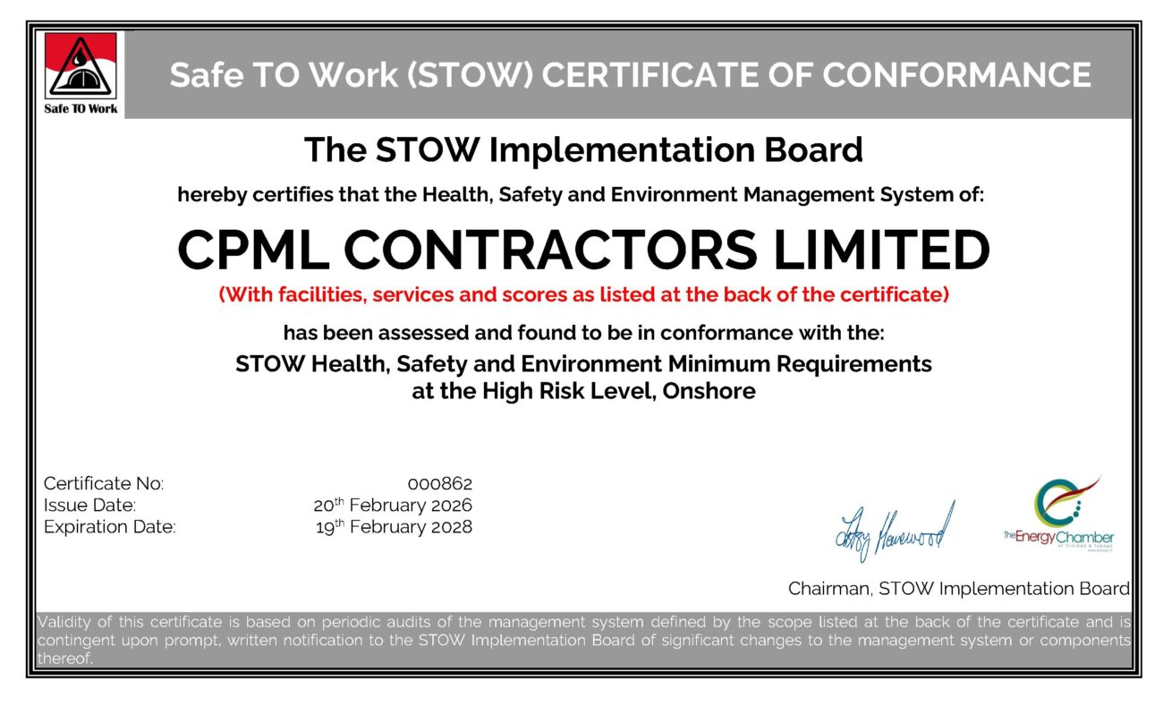 CPML Contractors is proud to be a STOW Certified Contractor for High-Risk Work, demonstrating our ability to meet internationally recognized safety standards within demanding construction and industrial environments.