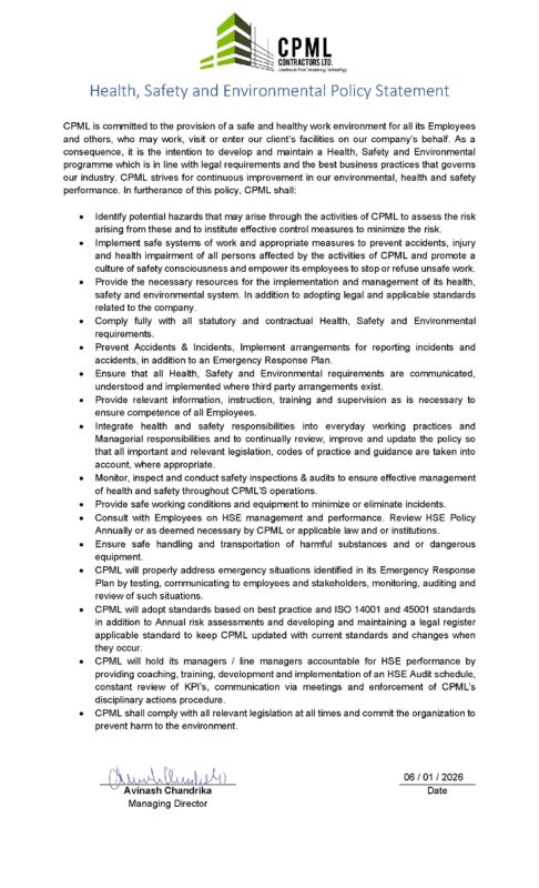 At CPML Contractors Limited, Health, Safety, Environment and Quality (HSEQ) are central to how we plan, manage, and deliver every project. Our team is committed to maintaining the highest standards of construction safety, environmental responsibility, and quality workmanship across all operations.